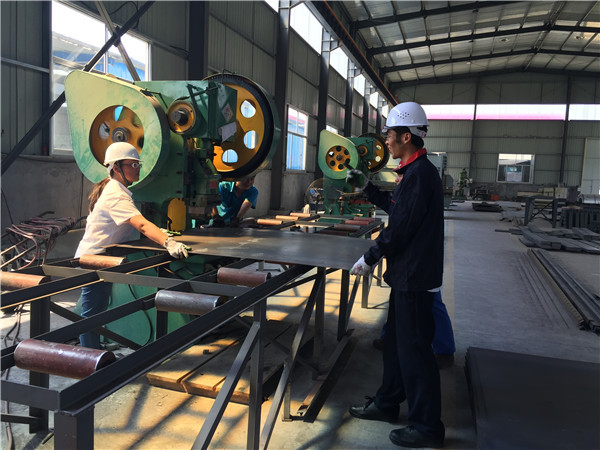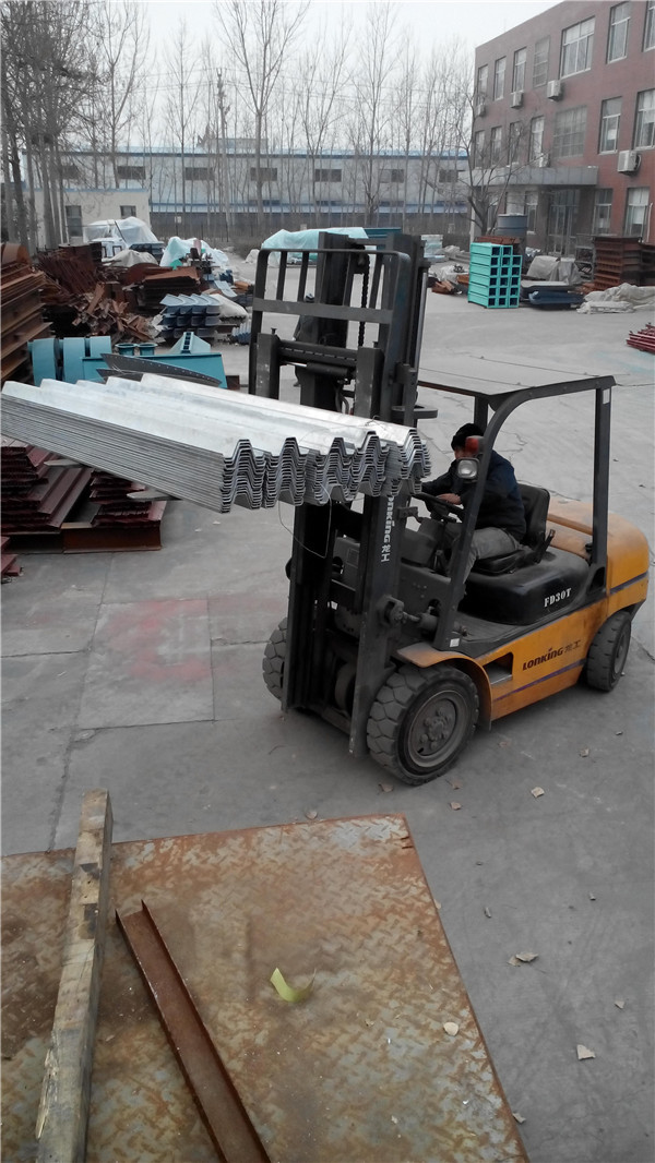 裝配式鋼板倉由壓型板z 型鋼立筋組成, 小倉、矮倉可以不設立筋或只設單筋( 每塊墻板對應一根立筋) , 大倉、高倉必須設置雙筋且立筋壁厚要逐次加厚。壓型鋼板從上到下要逐次加厚, 壓型鋼板以卷板為原料采用輥壓法在工廠預制完成, 逐道輥壓一次成型, 波紋形成后再經過沖孔工序、彎弧工序和鍍鋅工序等完成預制墻板工序, 包裝后運往倉庫或現場進行安裝。