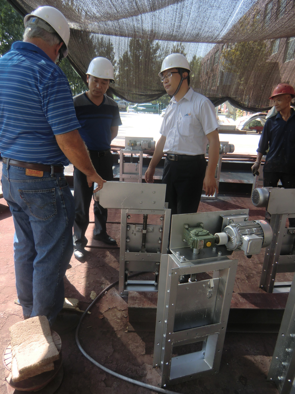 安裝時,根據(jù)倉徑的大小,采用多個吊裝架,吊裝架上固定一個手動葫蘆,使用特制的吊板用螺栓固定在倉壁墻板上,緩緩提升倉體。采取自上而下的安裝方式,即先安裝頂蓋、上層墻板,然后在裝中層墻板,再裝下層墻板,后將整個倉固定在基礎(chǔ)上。筒倉的構(gòu)件全部采用高強度螺栓連接,安裝方便、迅速、可靠。