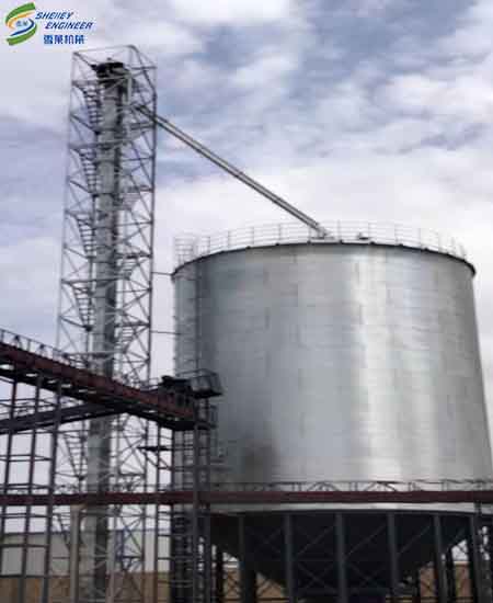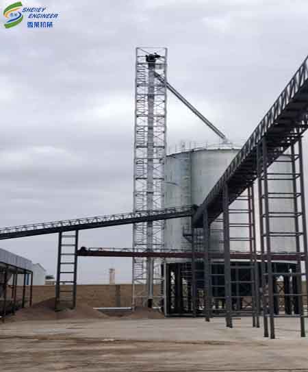 此項目工作流程為,光棉籽經卸糧坑進到提升機,提升機經流管將光棉籽輸送到鋼板倉中,糧食出倉時,錐底鋼板倉配合倉底閘門的開合通過倉底刮板機將糧食輸送到車間進行加工。