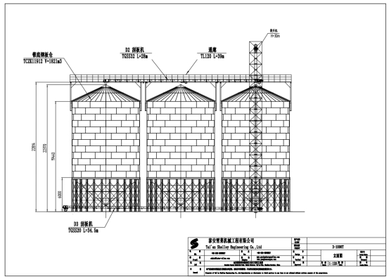 3臺tczk11914玉米鋼板倉項目,容積:2067m3 直徑: 11.9m 倉檐高:22.76m 總高:25.61m 錐頂角: 25。 倉頂蓋板為δ1.0mm熱鍍鋅板,選用國產優質熱鍍鋅板,倉頂上設置自然通風窗、人孔、爬梯,倉頂用航空膠泥和防水墊圈密封,沿倉檐四周設有安全防護欄。