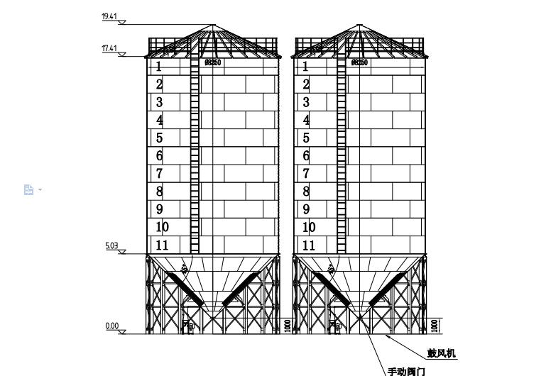 500T錐底鋼板倉主要用于存儲玉米。具有機械化程度高、易出料,使用壽命長。整倉容積:768m³;直徑: 8.2m;環梁高:5.53m,倉檐高:17.39m,總高:19.29m;錐頂角: 25。倉頂蓋板為δ1.0mm熱鍍鋅板,選用國產優質熱鍍鋅板,倉頂上設置自然通風窗、人孔、爬梯,倉頂用航空膠泥和防水墊圈密封,沿倉檐四周設有安全防護欄。