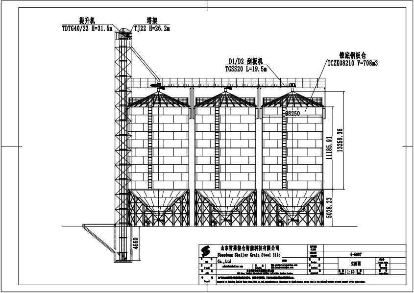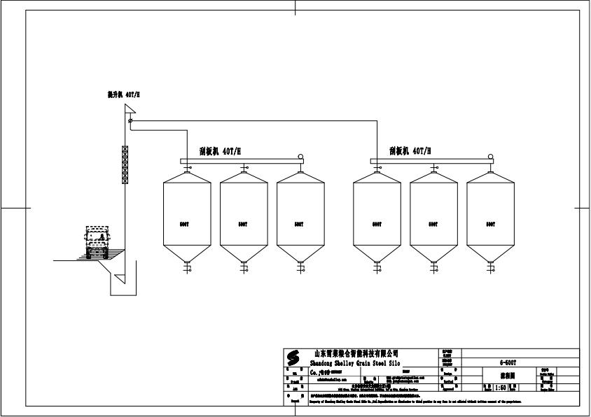 此項目為6臺500噸存儲玉米的全鋼錐底鋼板倉,三個倉一排,按照兩排分布,塔架設(shè)置在兩排中心位置,糧食經(jīng)卸糧坑輸送到提升機(jī)中,再經(jīng)提升機(jī)輸送到頂部配合電動三通,將糧食分別輸送到兩排鋼板倉中,倉內(nèi)設(shè)有通風(fēng)和測溫裝置,可以實時檢測倉內(nèi)糧食溫度和濕度變化,達(dá)到安全儲糧的作用。當(dāng)糧食出倉時,倉底刮板機(jī),將糧食輸送到指定位置。