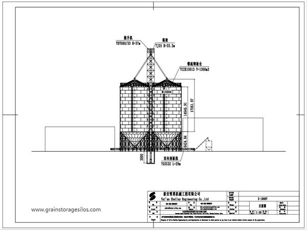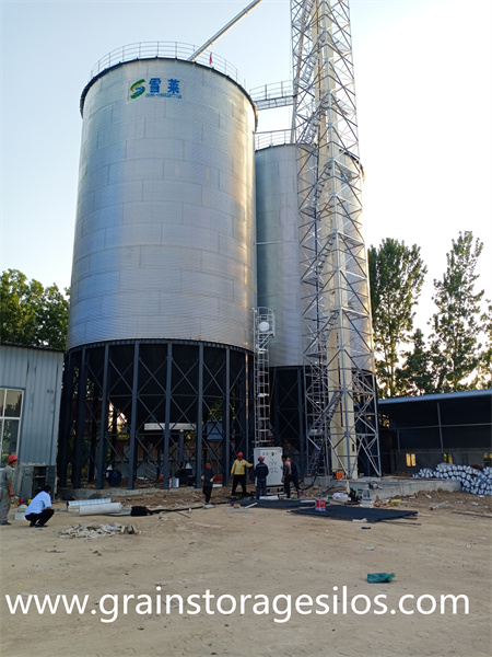 本項目鋼板倉由2臺1000噸鋼板倉組成,客戶為糧貿公司,存儲玉米,大豆等糧食使擁。2臺1000噸全鋼錐底鋼板倉并列排開,提升機位于兩個倉之間,將糧食提升上來以后,通過谷物溜管將糧食送進糧倉,節省了項目成本。